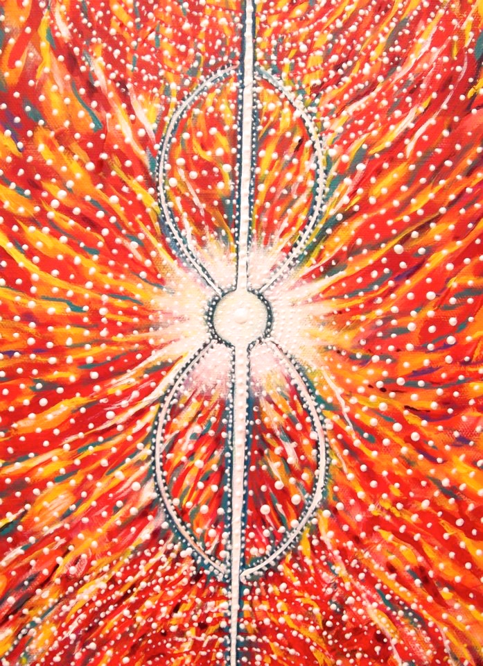 I don’t know much about science, but I’ve heard that matter can neither be created nor destroyed. Rather it is constantly moving from one form to another. When I look at this painting, I see atoms in a constant exchange of energy, connecting all beings – all matter, as if I’m looking into a microscope. I also see the cosmos as if looking through a powerful telescope. I breathe in atoms that were once a part of you. I breathe in energy that sustains me, that came from the Ultimate Creator, in whatever form to which I evolve.