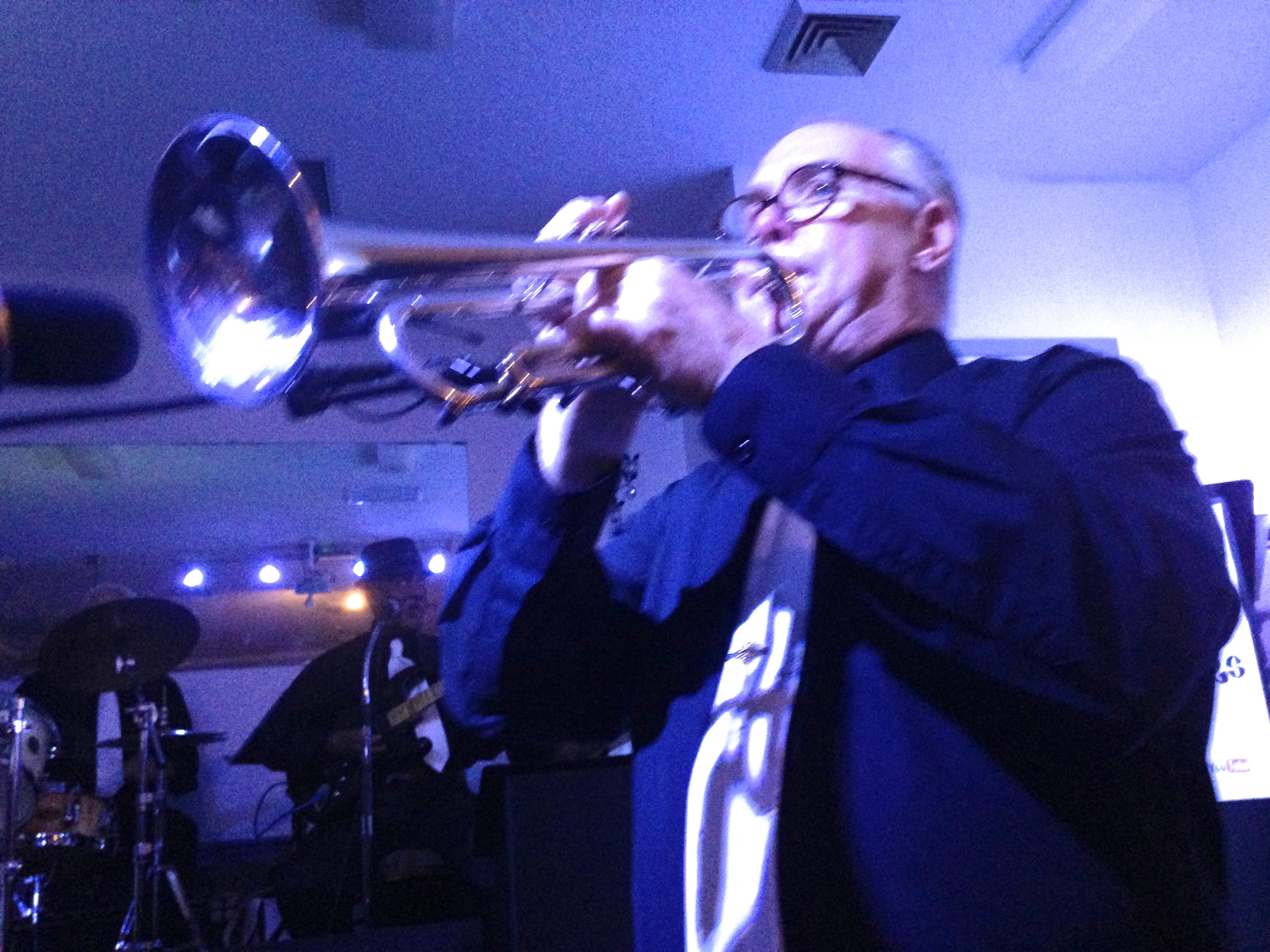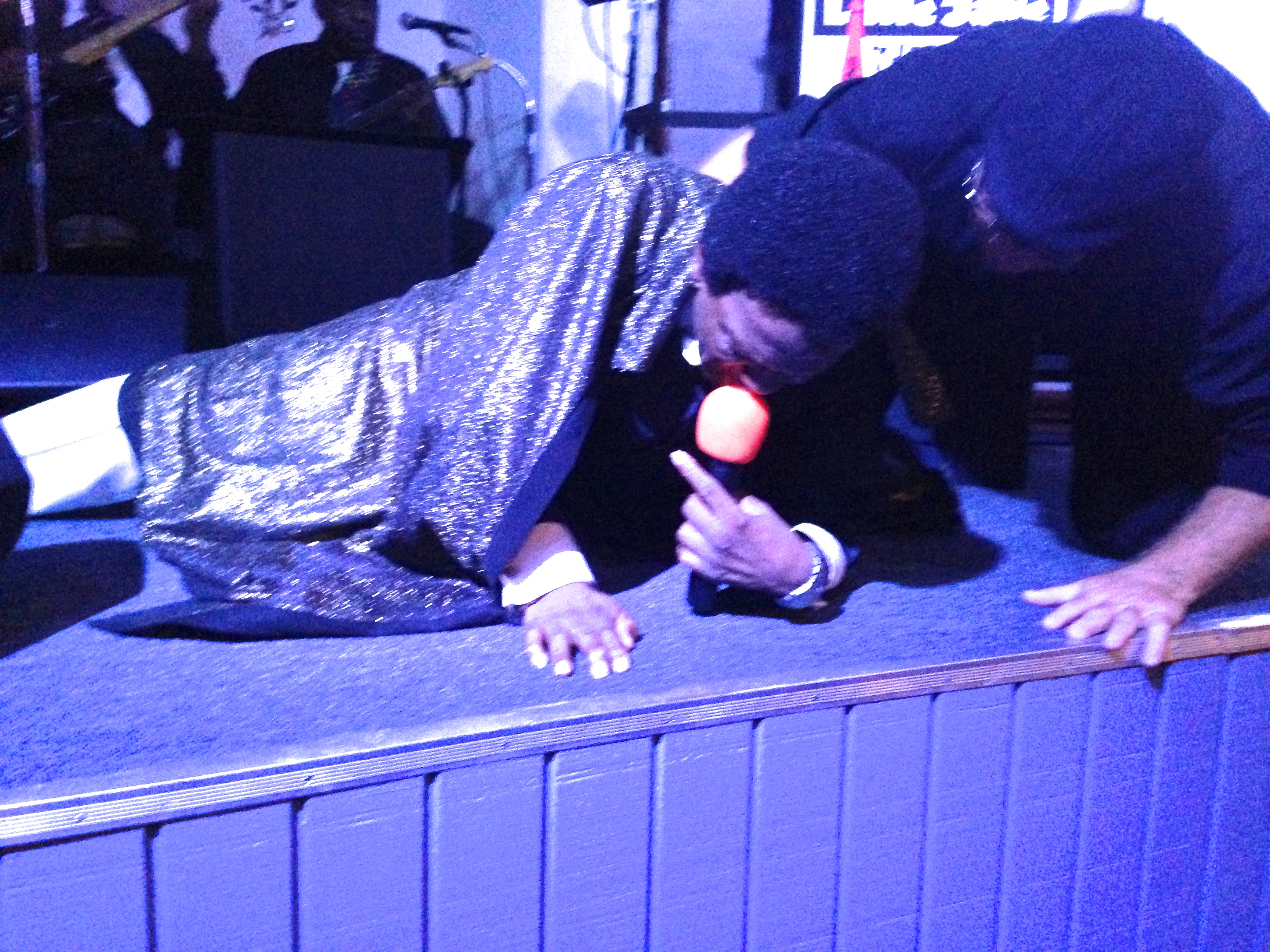 I follow the woman, expecting to leave the painting in a back room somewhere. But no! She leads me across the front of the room, in front of the whole crowd, to a table two feet away from the stage where Little Jake and the Soul Searchers are showering their energy over the happy crowd. I quietly put the painting under the table and look up at Little Jake who looks straight into my eyes, even as he keeps on singing, and I am magically transformed from a fussy old lady artist approaching her own 75th birthday into an 18 year old girl, swept away by the perfect harmonies of the Soul Searchers, who not only make magic with guitars and brass and keyboard and percussion but with perfect harmonies of their voices, all channeled into and through Little Jake himself as they lead us on a journey through the very best classic musical creations of the ’50’s and ’60’s. Little Jake’s performance makes every person there feel as if he is singing directly to them. He gives us no choice but to follow him with our eyes as he makes his way, slowly, deliberately off the stage, singing through the crowd, shaking hands, touching shoulders, and making eye contact. “Are you feeling good?” “Yeah!” we answer. “Are you feeling good?” “Yeah!!”